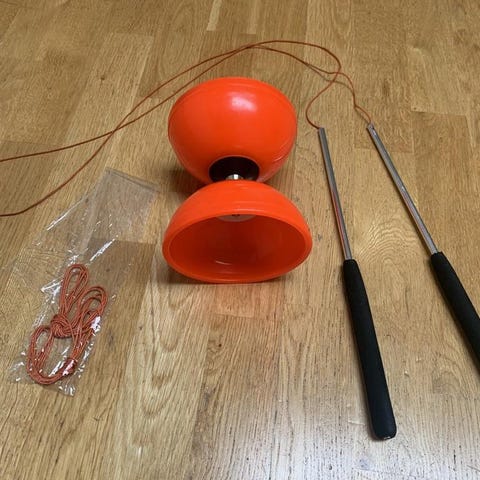 Som bilden visar. 3st Jongleringskäglor lite slitna men inte på handtagen. fyra stycken jonglerings bollar handgjorda i Polen ,
