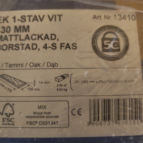 Vi renoverar en stor lägenhet och jag gjorde ett litet förhastat beslut när jag beställde 107 kvm ekgolv från Tyskland - eftersom jag och min flickvän inte var helt överens om vilket golv vi ville ha :) Slänger därför ut denna annons någon hade varit intresserad att köpa hela partiet eller delar av detta.