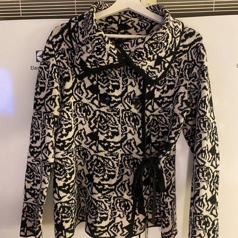 Lång, stickad cardigan med ett svart-vitt rombmönster och en lurvig textur från KappAhl. Storlek S