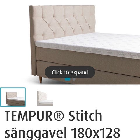 En sänggavel av märke Tempur Relaxation 180x110cn säljes för 2000kr. Tyget går att ta av och gaveln går att höja och sänka. Fästets i sängen med bultar.