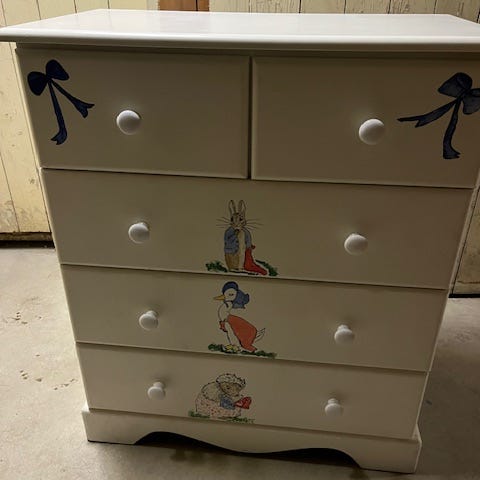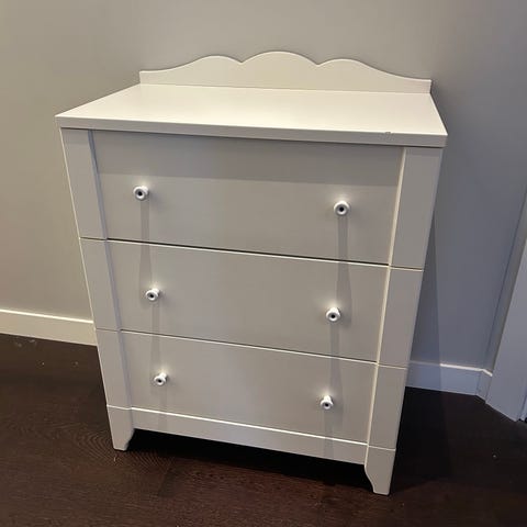 En fin byrå, köpt för 2 år sedan, har en liten defekt eftersom min dotter satte på en klistermärke och när jag tog bort den lossnade färgen, se bild. Höjd 84 cm, bredd 80 cm, djup 41 cm. Finns att hämta i Skogås.