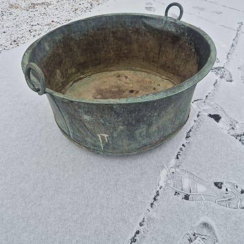 Stor gryta med avtappningsrör i gjutjärn