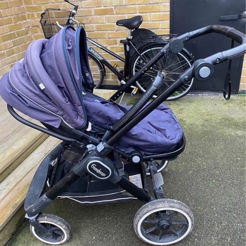 Med sidoväska, skötväska, sittdel, liggdel, regnskydd, nätskydd.