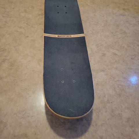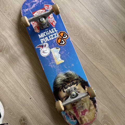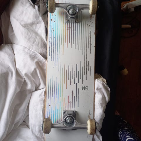 Okänd skateboard med grafiskt mönster på undersidan, använd. Inkluderar skyddsutrustning bestående av svart hjälm och knäskydd i nätpåse. Skyddsutrustningen är märkt med Pr. Storlek och material ej specificerat.