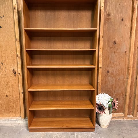 Teak bokhylla med vitrinskåp på höger + vänster och i mittpartiet barskåp och en låda. 3 nycklar finns Enligt vad jag kan se så är den delbar. Bredd 267cm höjd 174cm och djup 44cm. Snabb avhämtning prioteras