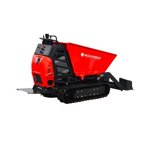 Självlastande minidumper TD800. Baljan rymmer 300 liter och lastvikten är hela 800kg. Egenvikten är 420kg. En mycket omtyckt dumper som tål ett hårt arbete, otroligt stark med en Briggs & Stratton motor på 13,5hp. Hastigheten är 0-4km/h.