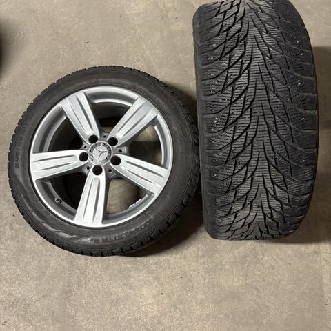 Friktionsdäck Hakkepeliitta 245/45 R17 på Mercedes originalfälgar med navkåpa. Sensorer för däcktryckskontroll är nya.