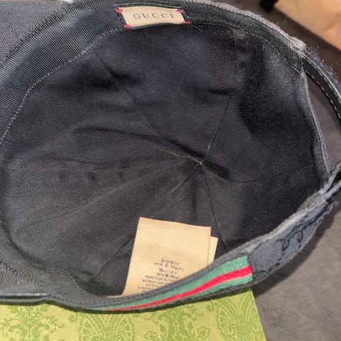 Gucci mössa i storlek S för herr, tillverkad av ull & kashmir. Mössan är grå med det karakteristiska Gucci-mönstret och har en rand i grönt och rött. Tillverkad i Italien. Endast kemtvätt rekommenderas.