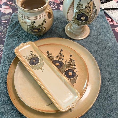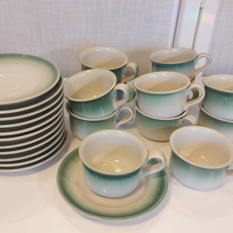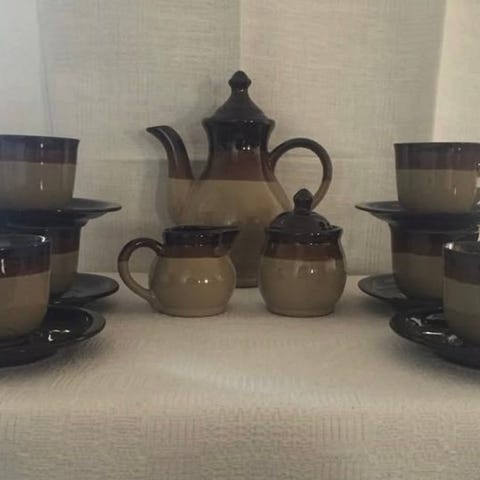 Turkos med brun insida, i bruksskick. Gabriel porslin. Kopp m fat x 4, assietter x 4, tallrik x 3, liten skål x 1, tekanna x 1, bringare x 1 samt ungsformar x 2, oval och fyrkantig form. Endast handdiskade