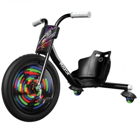 BMW Elektrisk Leksaksmotorcykel i vitt och svart med blå LED-lampor. Designad för barn med detaljer som handtag, sadel och hjul. Lämplig för inomhus- och utomhusbruk som leksak och transporthjälp för barn.