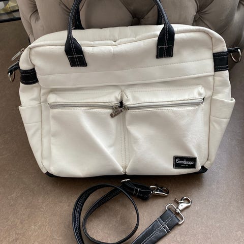 Diaper bag with lots of well placed compartments. It is well used and has some staining inside.