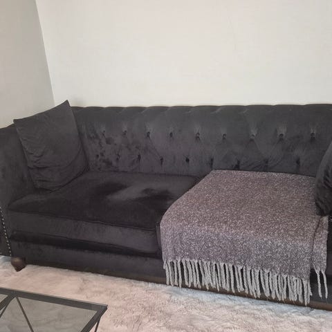 En tresitssig svart sammetssoffa som är sparamt använt då den stått i gästrummet.