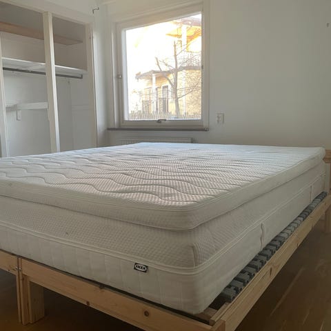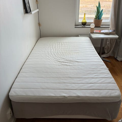 Kontinentalsäng från Mio i storlek 180x210 cm. Sängen är klädd i beiget tyg, 4 ben i borstat stål ingår. Sängen har två kassetter, fast/fast. Väldigt bra skick. Hämtas i Fruängen.