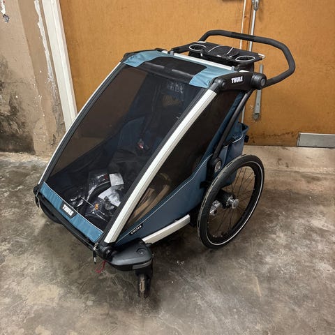 Jogging, cykel och skidvagn plats för två barn. Det ingår löparar hjul, cykel utrustning och sele för längdskidåkning och längdåknings skidor.