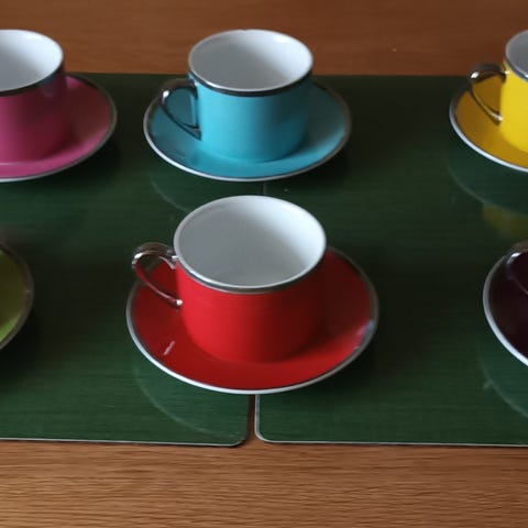 "Sex kaffekoppar med tillhörande fat, av Rökopal.