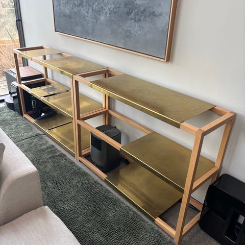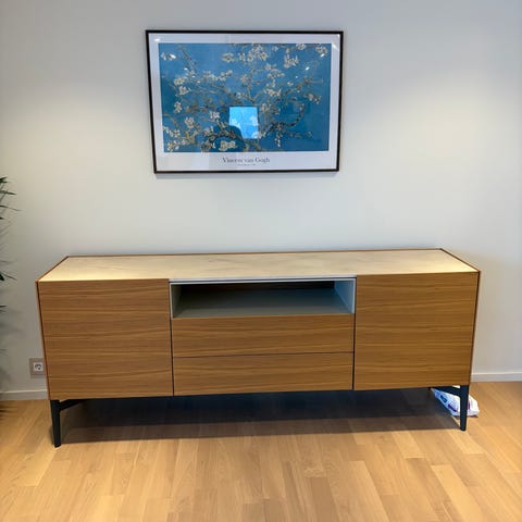 Gediget sideboard i svartbetsad ek med tre hyllan som vilar på en dekorativ svart stålram.