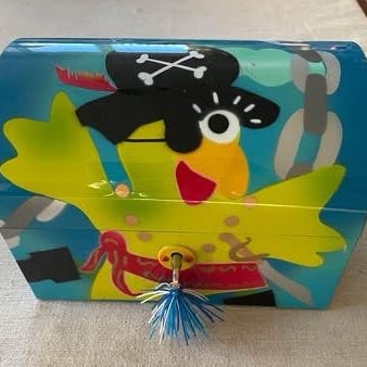 Gul/rött barnskrin med lås och nyckel.. läLite trögt i låset.