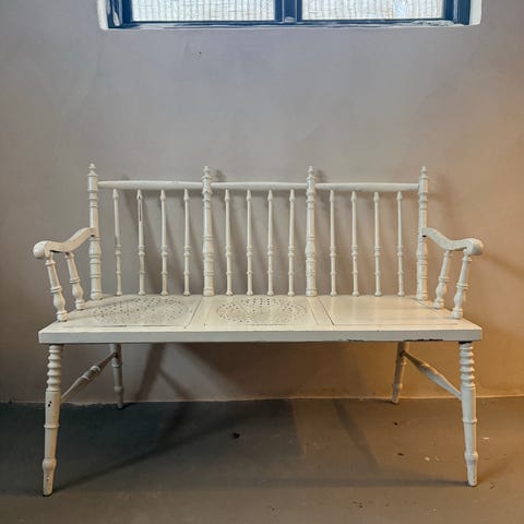 Har ärv av min farmor som fick den av en äldre släkting. Soffa i klassisk stil med träram och svarvade ben. Klädd i gul- och beige-randigt tyg med ornamentmönster. Passar som sittmöbel i vardagsrum eller sällskapsrum. Träramen har profilerade detaljer och benen är svagt svängda framtill. Sits och rygg är helklädda i samma tyg för en enhetlig design. Har sett på antik sidor att de säljs mellan 1500 - 3000 kr. Denna soffan har hjul på frambenen - vilket har ett högre värde.