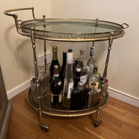 Serveringsvagn i trä i engelsk stil med två hyllplan och en låda som går igenom och kan öppnas på båda sidorna. Vagnen har stora hjul på ena sidan och mindre hjul på andra sidan för enkel förflyttning. Designen inkluderar svarvade ben och handtag på ena sidan. Passar för servering eller som avlastningsbord i hemmet. Från 50-talet. Längd ca 82 cm, bredd 45 cm, höjd 68 cm.