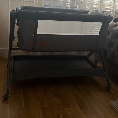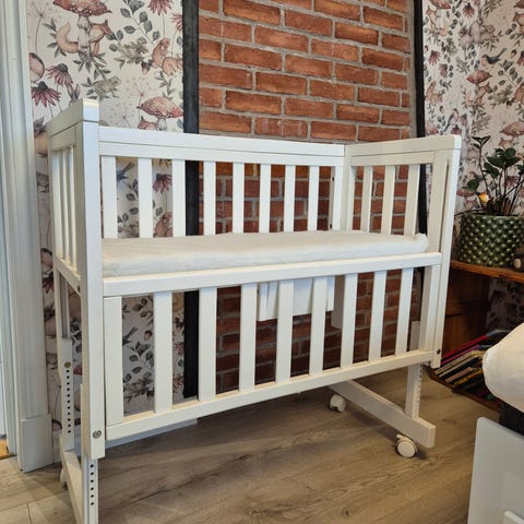 Sidosäng/bedside crib i mycket fint skick och fin ljusgrå färg. Den långa sidan kan sänkas, och sängbasen kan justeras till nio olika höjder så den passar höjden på din säng. Monterad med låsbara hjul. Madrass ingår.
