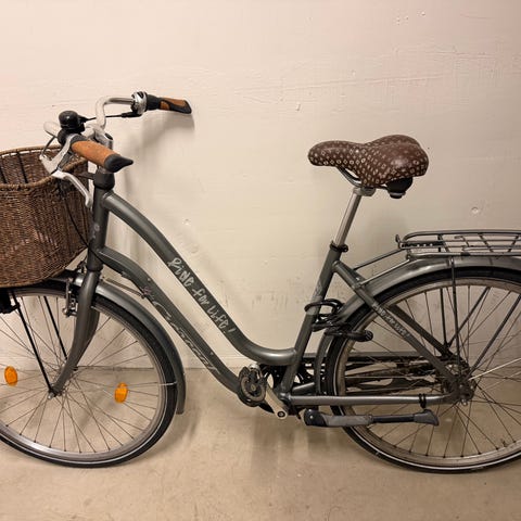 En fullt fungerande tre växlad cykel med batterilysen och cykelkorg.