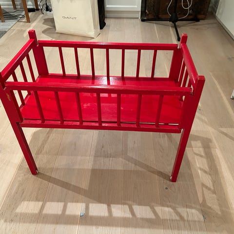 Gammal docksäng i trä. Mått: 55 cm lång, 35 cm bred, 40 cm hög i huvudändan och 35 cm hög i fotändan. Endast avhämtning och betalning med Swish.