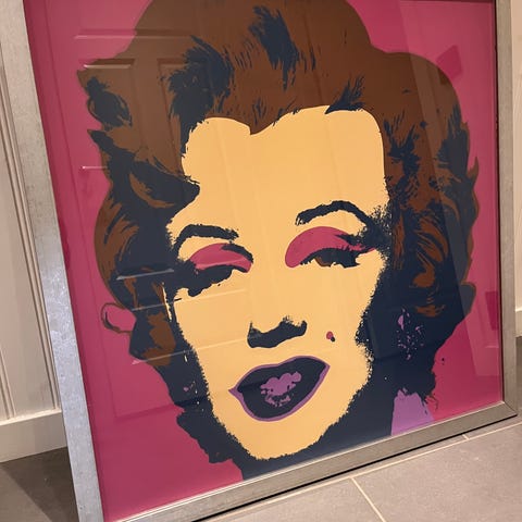 Warhols samling av 10 stycken färgserigrafier av Marilyn. Stämplade i blått på baksidan: "fill in your own signature" och "published by Sunday B. Morning". Tror de är från 1990-talet. Samtliga är ramade, mått ca 94 x 94 cm. Pris eller bud, vill dock sälja alla i ett parti.