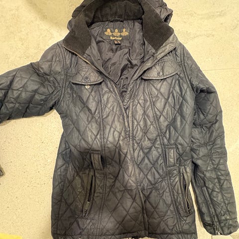 Barbour jacka för en XS dam och passar även ca 160-170cl och är märkt XL barn. Jag har köpt den på Länna sport till mitt barn men den blev aldrig använd. Jackan har klassiskt snitt och är vadderad, har en dragkedja framtill samt en huva. Snygga detaljer med en ficka fram etc.