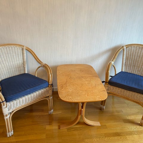 Brun korgstol med beige sittdyna. Färgen något avskaft fläckvis. Annars i gott skick.