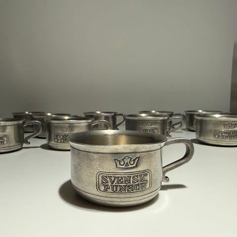 5 st Norsk tenn med mönster av folkfest och dans. 5 cm höga i gott skick