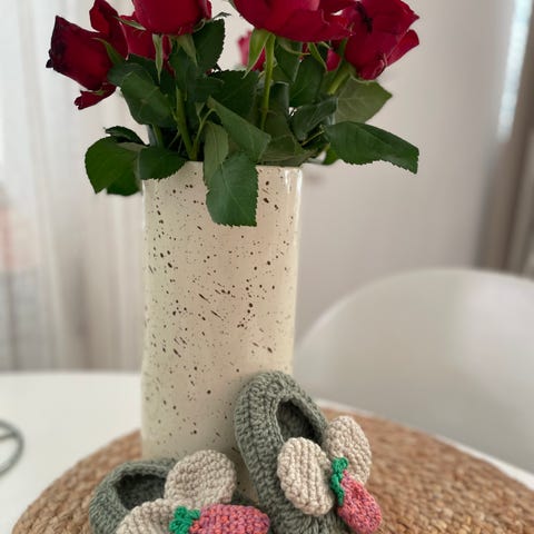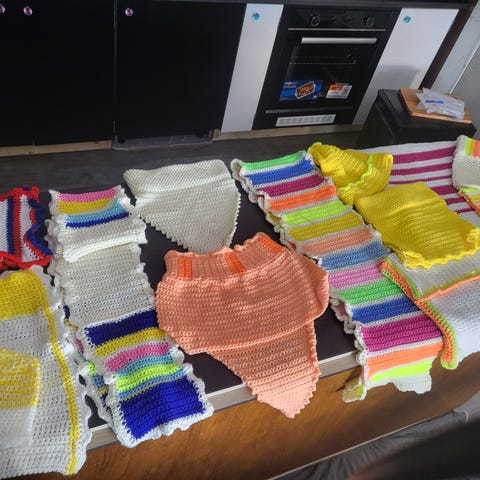 Hon gör barnkläder, mössor till både barn och vuxna.