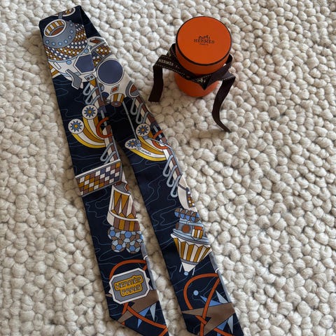 Hermes Twilly, se färgerna på bilderna (kan skicka fler). Använd ett fåtal gånger, påse och ask medföljer. Inköpt på Hermes NK. Nypris 2650kr