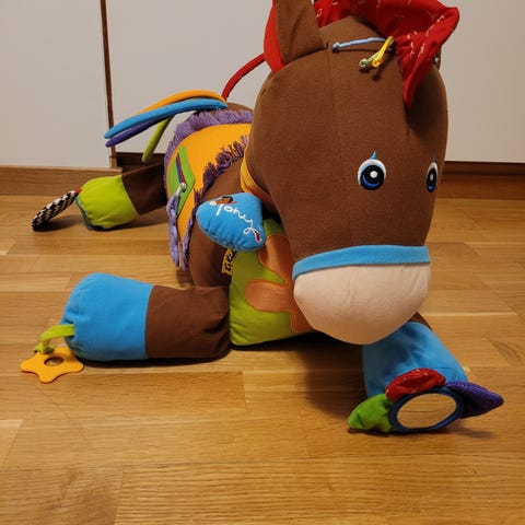 Gungande häst leksak i mjukt material med brun färg och röda detaljer. Utrustad med sadel och tygbandana. Passar för barn och är avsedd för inomhusbruk.