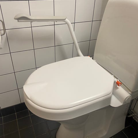 Toalettstolsförhöjning med sits och lock av plast som enkelt kan tas bort vid rengöring. Justerbar fot för ojämnt underlag. Stänkskydd ingår. Placeras ovanpå toaletten. Kan användas som fristående toalett om stänkskyddet byts mot hink.