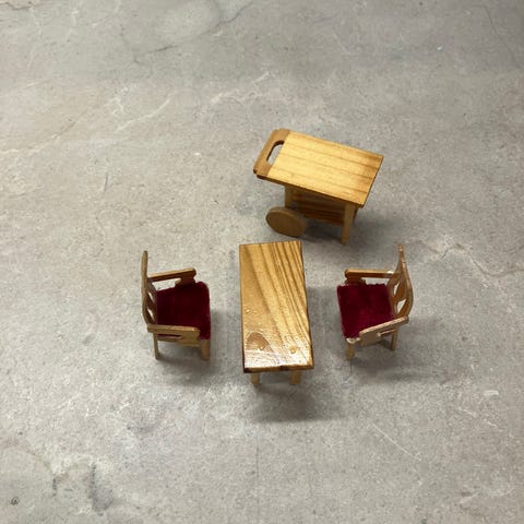 Två stolar med bord och ett skåp i trä. Går inte att öppna något i skåpet. Är i nyskick. Är från slutet av 90-talet/början av 00-talet