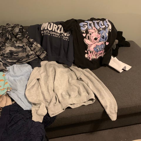Ett klädpaket med olika plagg. Innehåller bland annat tröjor, byxor, en klänning och fleecetröja. Färgerna varierar mellan rosa, lila, grå och svart/vit.