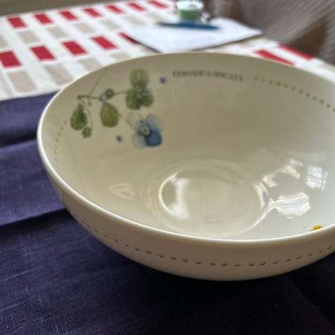 Porslinsservis från Caleca-serien ”Giardino”. Notera att det står "Made in China" på porslinet, så jag vet inte om det är orginal eller inte, men de är fortfarande väldigt vackra och funktionella. Har stått relativt orörda i sommarstugan i flera decennier.