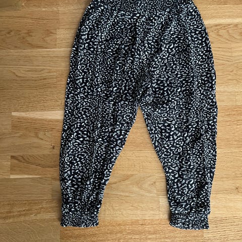 Byxorna har ett mönster med rutor i svart och vitt, samt diskreta rosa linjer. Knapp- och dragkedjeförslutning samt resår i midjan för justerbar passform.