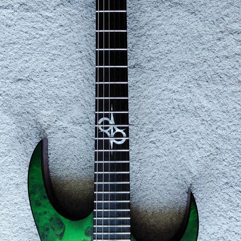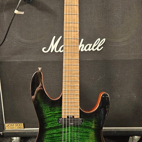 En 8-strängad fan-fret gitarr med genomgående hals i bra skick.