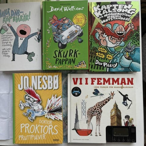 En samling av olika klassiska barnböcker inklusive titlar som Robinson Crusoe, Barbro och en fjärdedel, och andra svenska och internationella verk. Böckerna varierar i storlek, färg och material, och är avsedda för läsning av ungdomar och barn. Samlingen innehåller både illustrerade och textbaserade böcker med olika teman och berättelser.