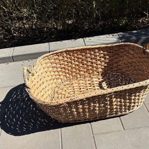 Äldre större korg. Höjd 26-28 cm. Bredd ”baksida” 34-38 cm. Djup 40 cm. 250:-. Skickas ej, kan hämtas i Helsingborg.
