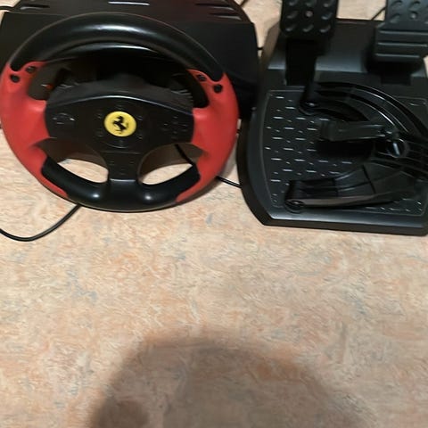 Ferrari Racing Wheel är en spelratt med tillhörande pedalset och rattstång. Ratten är svart och röd med Ferrari-logotyp. Pedalsetet har gas- och bromspedaler monterade på en svart bas. Produkten är avsedd för användning med bilsimulatorer och racingspel.