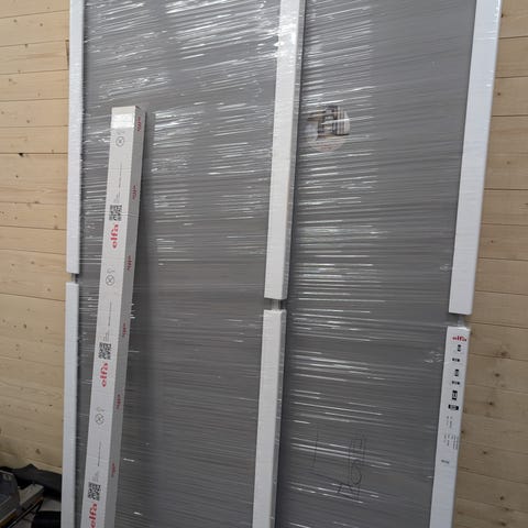 En ny och tidigare omonterad entrédörr och karm i aluminium inkl. handtag. Nypris 15000k. Nu 8000kr. Bredd:1100mm. Höjd: 2120mm.