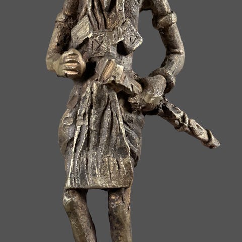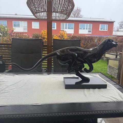 Pose med upplyfta framben kan tyda på att figuren är gjord för att se välkomnande ut, kanske avsedd att stå vid en entré, uteplats eller i en trädgård.