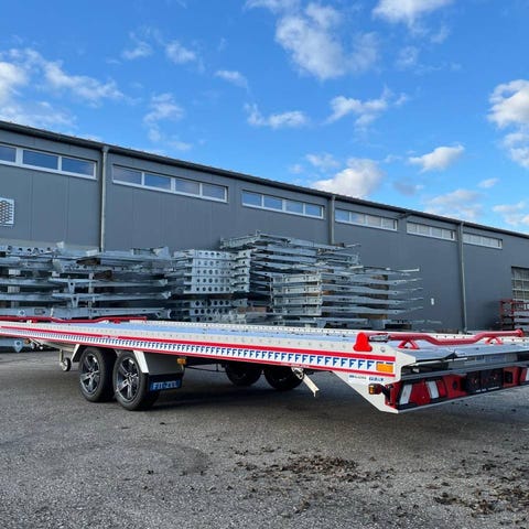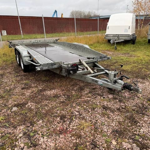 Släpet har en stålbanor att köra upp bilarna på och flakskiva i mitten av träplyfa, det är gott om bindöglor i flaket för en enkel surrning av lasten, oavsett om det är en bil eller maskin.