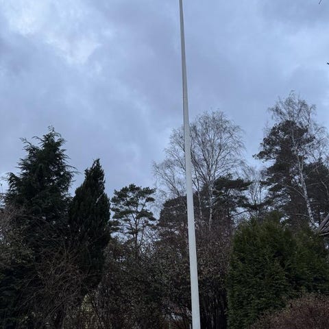 Flaggstång i trä med en höjd på ca 7-8 meter, målad i vit färg. Flaggstången är utrustad med fäste och beslag för flagga. Passar för utomhusbruk i trädgårdar eller på gårdar.