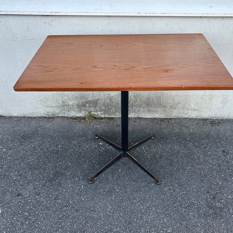 Äldre bord med metallfot och ovanlig och vacker laminatskiva. Bordet är 85 cm x 65.