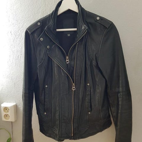 Jättefin äkta svart skinnjacka i storlek 34/xs med detaljer i guldfärgat metall. Den har dragkedjor vid fickor och ärmar samt tryckknappar vid kragen. Inga defekter, jättefint skick.