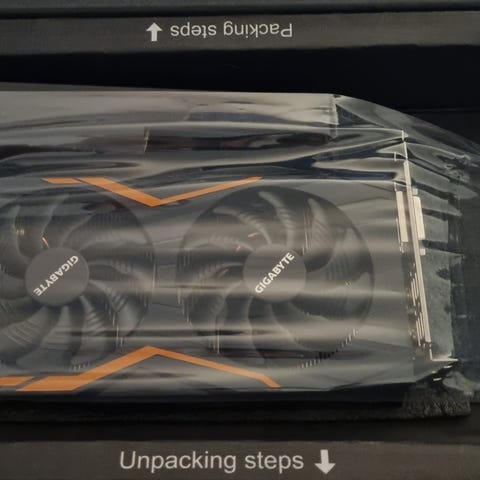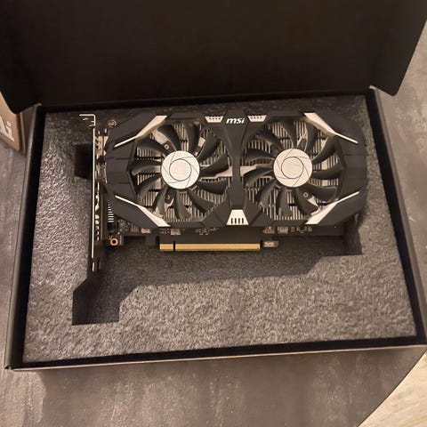 Okänt märke grafikkort med kylfläkt och flera anslutningsportar inklusive VGA, HDMI och DisplayPort. Kortet är avsett som ett tillbehör för datorer och ansluts via PCI Express-gränssnitt. Färg svart med röda detaljer.