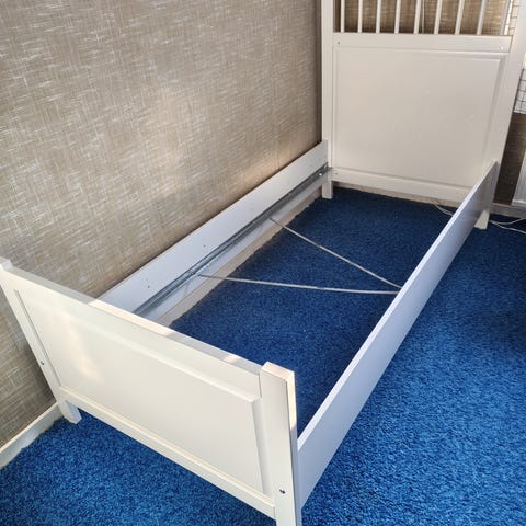 Har använts med madrasskydd och bäddmadrass ovanpå. Madrasskydden följer med som skydd när ni fraktar hem dem.